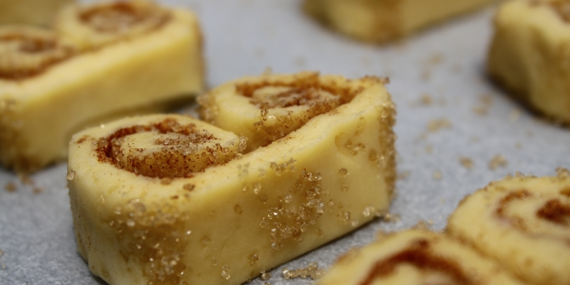 Preheat oven to 180 C. Lightly flour your bench top and lay on it the puff pastry, or, roll out the sour cream pastry until it is about 3 mm thick and forms a rectangle 35 cm x 30 cm. Sprinkle generously with the cinnamon and about 3/4 of the sugar. Roll up from the longest side until you get to the middle and then do the same from the other side. Using a sharp knife, cut into thin slices, sprinkle with the remaining sugar, and lay carefully on a baking tray lined with silicon paper (see the picture below).