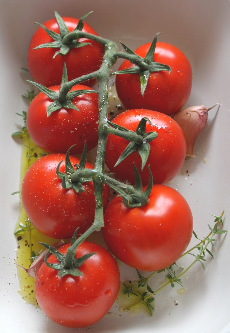 8 – 10 truss tomatoes (bigger than cherry tomatoes but smaller than a regular tomato was the size I used. If all you can find are cherry tomatoes, then just use double the amount)
