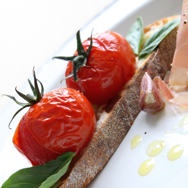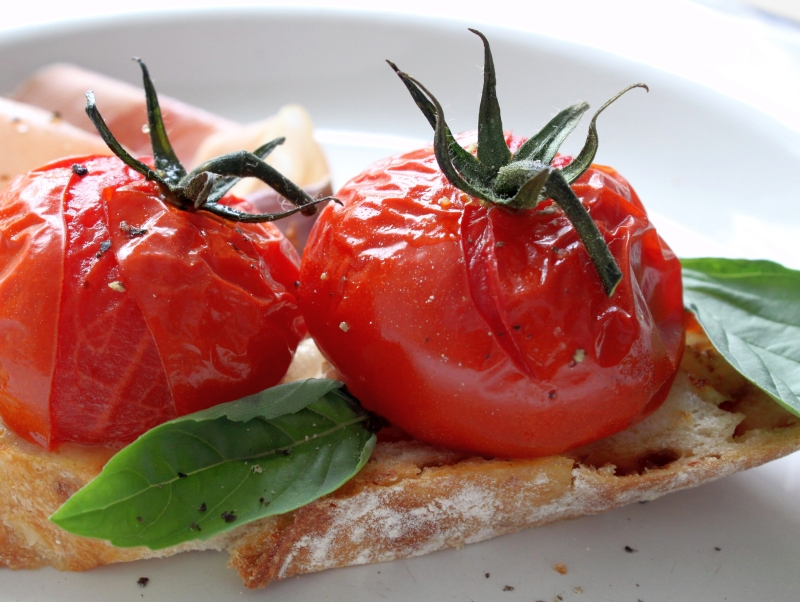 Hot summer’s day, vine ripened tomatoes, basil explosion in the vegetable garden and a loaf of fresh sourdough. All the elements were aligned in our house today to make this oh, so simple, but so delicious lunch. It’s nothing more than really lovely tomatoes gently roasted with a little olive oil, salt, pepper, garlic and thyme squashed onto toasted sourdough. Sprinkle over some fresh basil leaves and a slice or two of paper thin prosciutto and it’s ready to eat. Miss 12 is a passionate tomato lover and declared that she could have eaten the whole pan of them with no difficulty at all. We remarked that if one is to have a long term food weakness, then tomatoes is a much healthier option than chocolate ice cream or cheese! Serve this up for your family for lunch and watch it disappear. I’ve given quantities for 2 people but it is easy to double or even triple the recipe to feed a crowd.