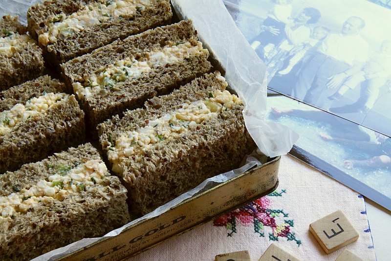 Sunday drives, picnics at the seaside, family parties and church fellowship teas always included sandwiches, and mum’s specialties were ham and pickles, roast beef and mustard, and curried egg. I have made egg sandwiches my own over the last few years, especially as I have catered for a number afternoon tea weddings, where finger sandwiches are always on the menu. I make them with rye bread or a dark multi grain loaf in contrast to the filling. Needless to say the 1960s version was always soft white bread. Enjoy these sandwiches next time you picnic with friends, or want something a little fancy for afternoon tea,