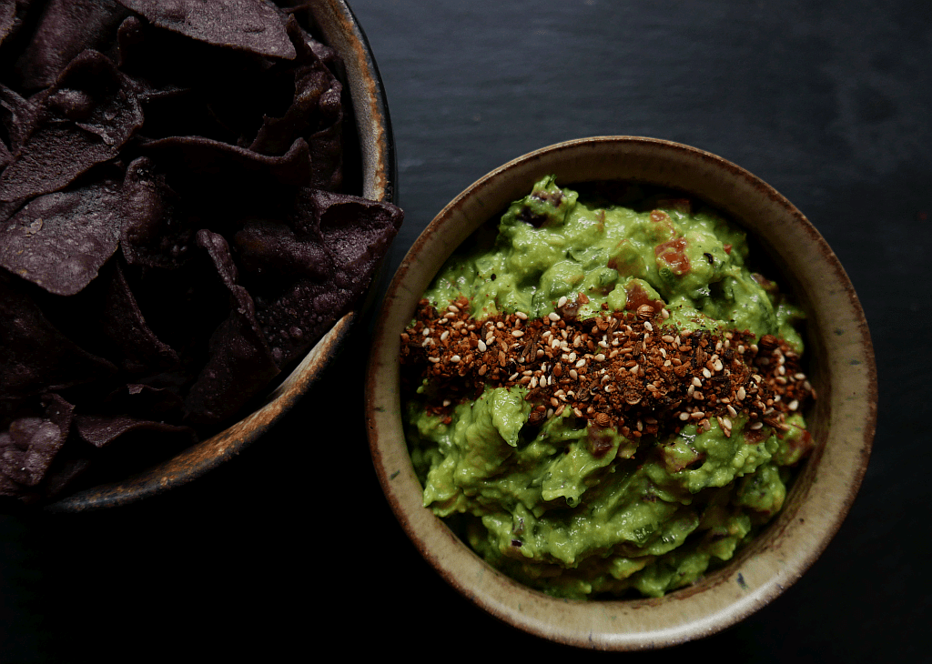 A perennial favourite, everyone has their preferred recipe for guacamole. and this is mine – smooth and creamy avocado contrasting with tomatoes, chilli, onion and herbs. There’s a tang of lemon, and the earthy notes of coriander in the dukkah I sprinkle on top, as well as a good seasoning of salt and black pepper. It’s very good with tortilla chips, on top of nachos, or folded into a soft taco or burrito. But it is also superb piled onto a piece of toast with soft feta and fresh coriander scattered on top. This recipe makes enough for a crowd, and it will keep for a couple of days. Perfect for summer afternoon drinks with good friends.